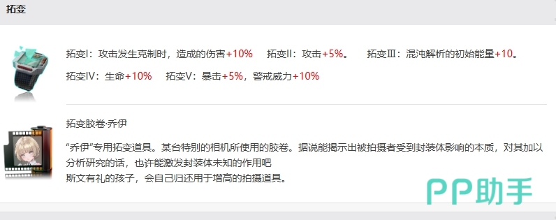 而当乔伊贴靠掩体后,他的下一次攻击暴击率再次提升10%,伤害也相应增加10%,随着拓变的发生,这些效果还会进一步增强,例如拓变I使得攻击发生克制时造成的伤害增加10%,拓变II则直接提升攻击力5%,拓变Ⅲ让混沌解析的初始能量增加10%,拓变IV使生命值提升10%,而拓变V则同时提升暴击率5%和警戒威力10%。