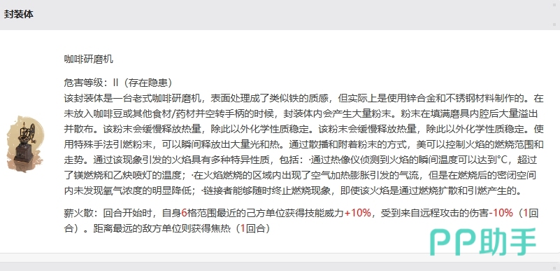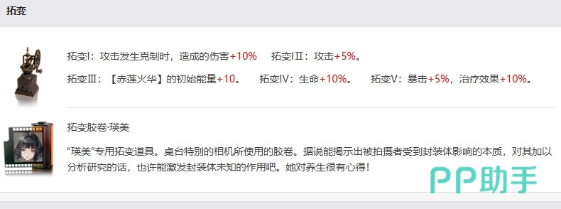 它可以带来薪火散的效果,在回合开始时,自身6格范围最近的己方单位获得技能威力+10%,受到来自远程攻击的伤害-10%,效果只能持续1回合,但距离最远的敌方单位则获得焦热1回合,使其陷入混乱之中,随着瑛美的不断成长和探索,她的封装体也经历了多次拓变,拓变I使她在攻击发生克制时造成的伤害+10%,拓变II增加了她的基础攻击力5%,拓变III提升了赤莲火华的初始能量+10%。