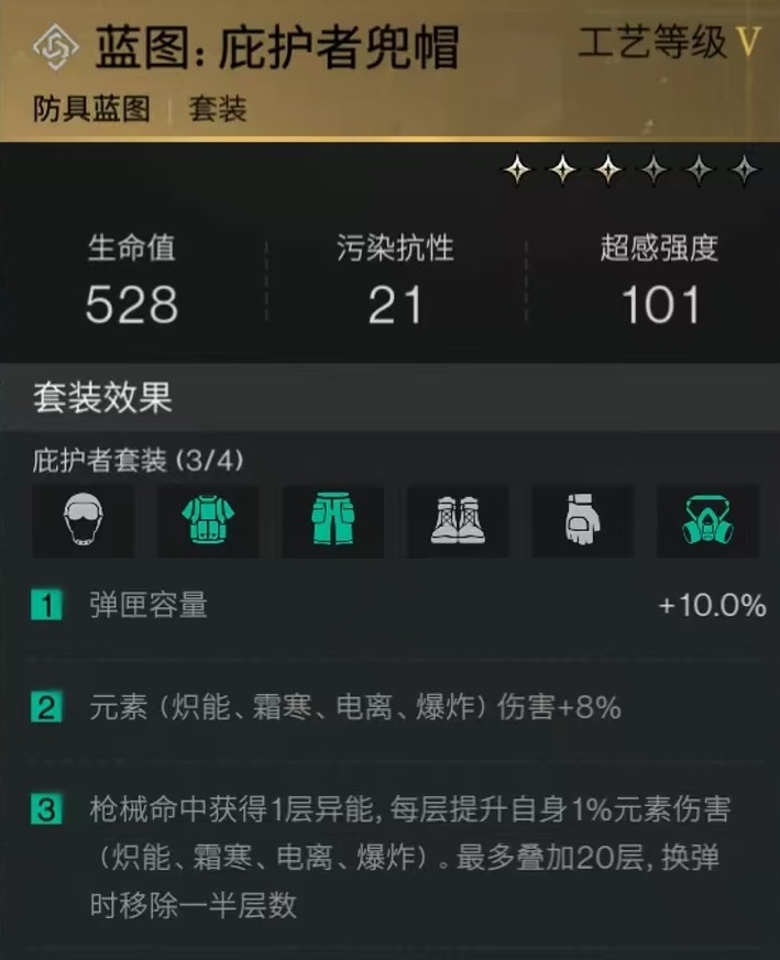 结合这样的效果,这把武器是属于几率触发,而并不是让怒火攻心这样可以通过固定的次数触发,几率触发的特点是挂火并不稳定,凭借属性可以打出较好的范围伤害,在清理杂兵的时候表现非常出色。为了能够进一步强化这款武器的输出特点,在后续配装方面,小编推荐选择庇护者套装三件,再加上两件拯救者。这样一来元素伤害和弹匣容量都能够大幅提升,利用命中之后叠加的异能层数,还可以增加元素伤害,以及在血量较高时提升枪械伤害以及异常伤害等。
