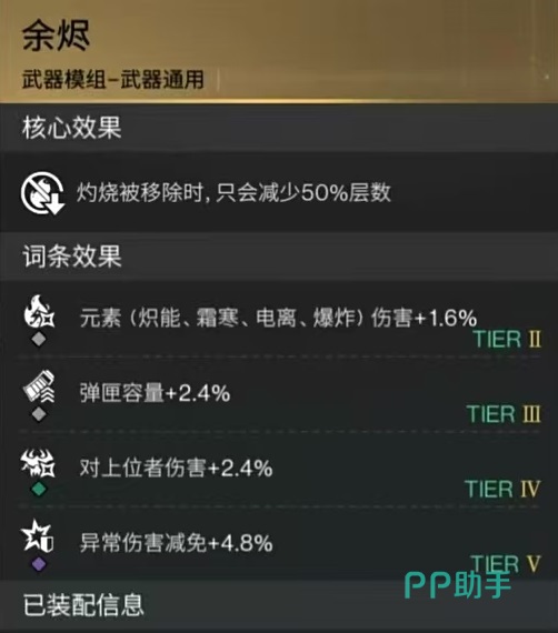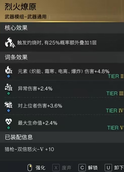 手套方面选择BBQ手套,它的关键效果为灼烧层数越高,伤害触发的频率也就越高,最高可以提升到100%。在最重要的武器模组方面,有三个可以选择的类型,分别是余烬、火焰共鸣或烈火燎原。余烬的特点是灼烧被移除时只会减少50%层数,火焰共鸣可以使灼烧的最大层数增加两层,持续时间降低。烈火燎原可以在触发灼烧时有额外几率叠加一层,这三种其实在强度方面非常接近。