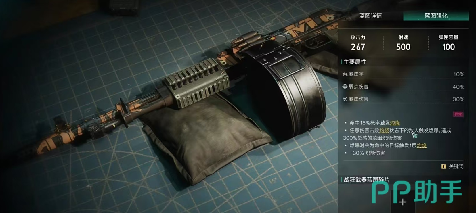 要爆炸了是一款霰弹枪类型的武器,它弹匣容量高,射速快,攻击力不俗,主要属性包括增加10%暴击率,40%弱点伤害和30%暴击伤害。在命中目标时有18%几率能够触发灼烧。任意伤害击败被灼烧状态所影响的敌人,都能触发燃爆,造成一次300%超感的范围炽能伤害,燃爆时还会为目标附加一层灼烧,增加30%炽能伤害等。