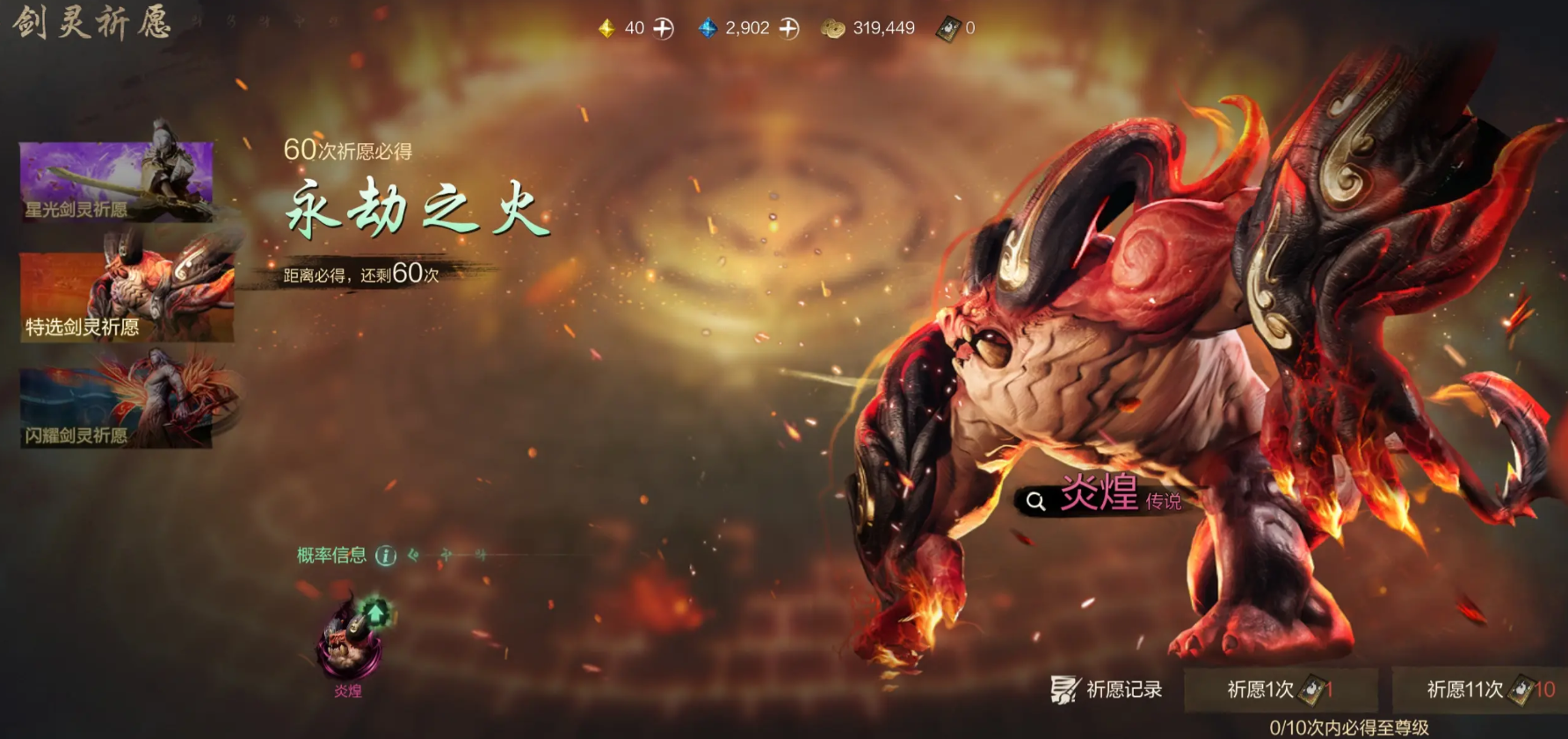 还有一个卡池叫做特选剑灵祈愿,这个卡池就可以从众多的剑灵中选出一个极为特别的剑灵。例如当前up的剑灵是炎煌的话,那么大家只需要抽取60次就可以100%获得。然后它的抽取规则也其他卡池一样,当然抽不到的话也可以获得其他品质的剑灵或者道具。所以大家根本就不需要灰心,最好连续多抽10次。如果这次抽不到的话,那概率就会继承到下一个版本的卡池里。