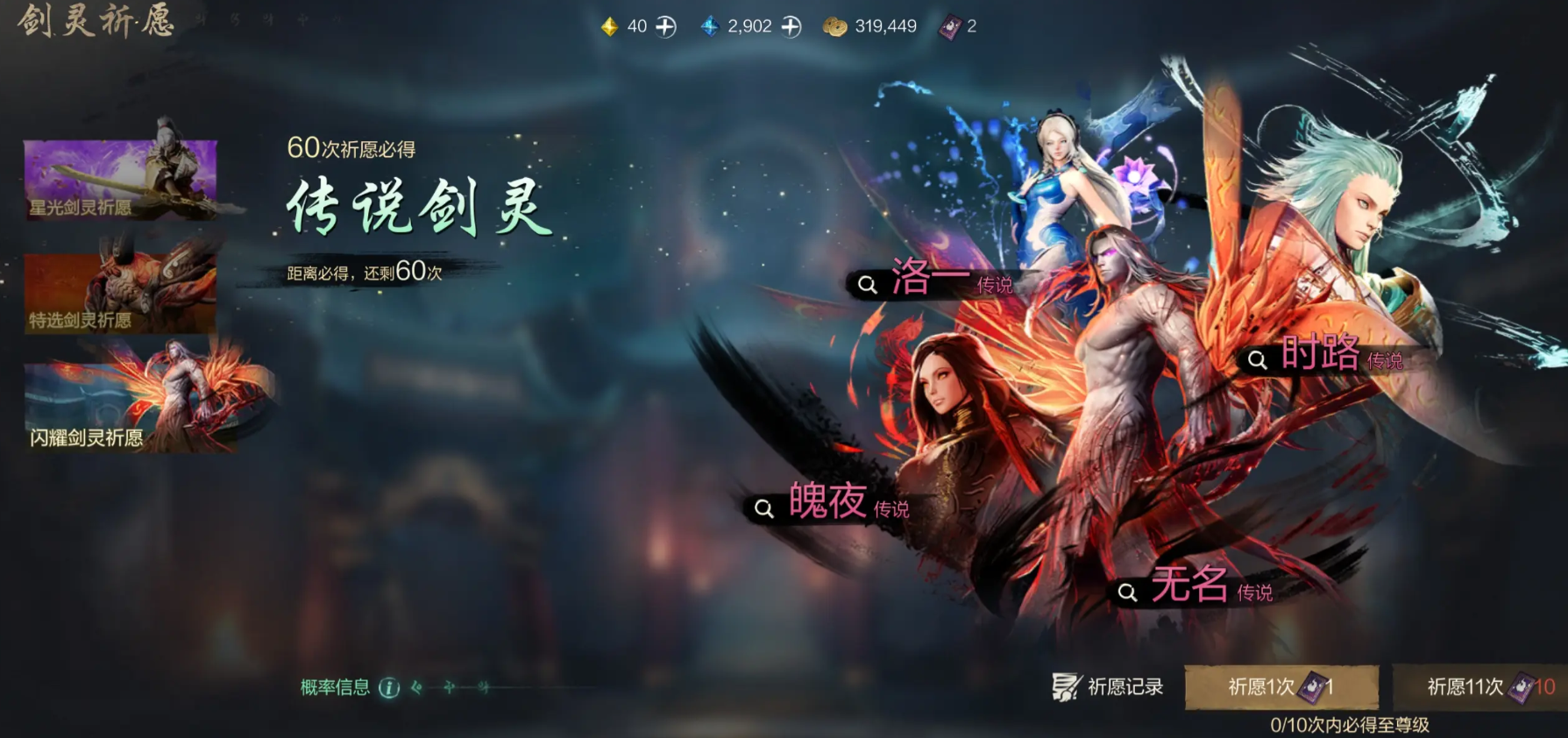 如果大家只需要传说剑灵的话,这可以前往闪耀剑灵祈愿卡池。这里存在各种强大的传说剑灵,并且只需要抽60次就可以100%获得一只。可选的剑灵同样多种多样,如果大家抽卡道具不足的话,也可以使用神石按比例兑换。