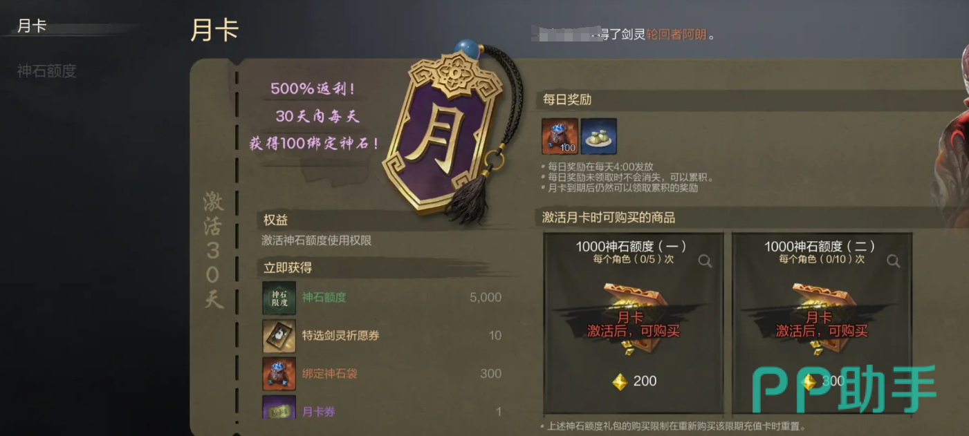 如果大家不想要花太多的钱,就可以获得足够数量的抽卡道具。那么就可以选择开通月卡,月卡可以让你获得5000个神石,以及多张剑灵祈愿券,还有各种绑定神石。再搭配上平常做任务或者做活动获得的神石以及祈愿券,只要大家好好玩的话。基本上每个月都可以抽到自己想要的剑灵,甚至可用多余的神石选择一把趁手的武器。