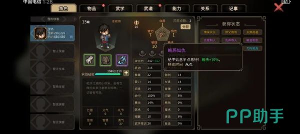 武功体系,使您可自由组合功法,创造自己战斗风格。例如在学绝世剑法的同时可练内功心法而成攻守兼备之全才;还能集中精力于某类武功成为极致剑客或者拳师。