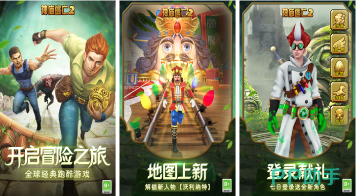 神庙逃亡2这个品质卓越的跑酷游戏在手游行业经久不衰,第二代作品更新了更多的地图和丰富的角色,全新的跑酷体验更加刺激而且耐玩性还不错,游戏可以使用重力感应进行操作所以对手残党玩家还是很友好的,跑酷过程十分精彩也容易给人血脉喷张的感觉,时刻被怪物紧追不舍的紧张感也令人欲罢不能。