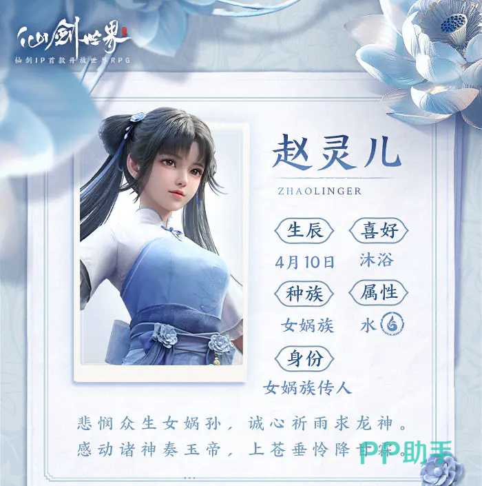 赵灵儿的属性是水,平时最喜欢的事情就是沐浴了,她的武器是天蛇杖,是女娲族后人的传承法器,象征女娲后裔的身份。