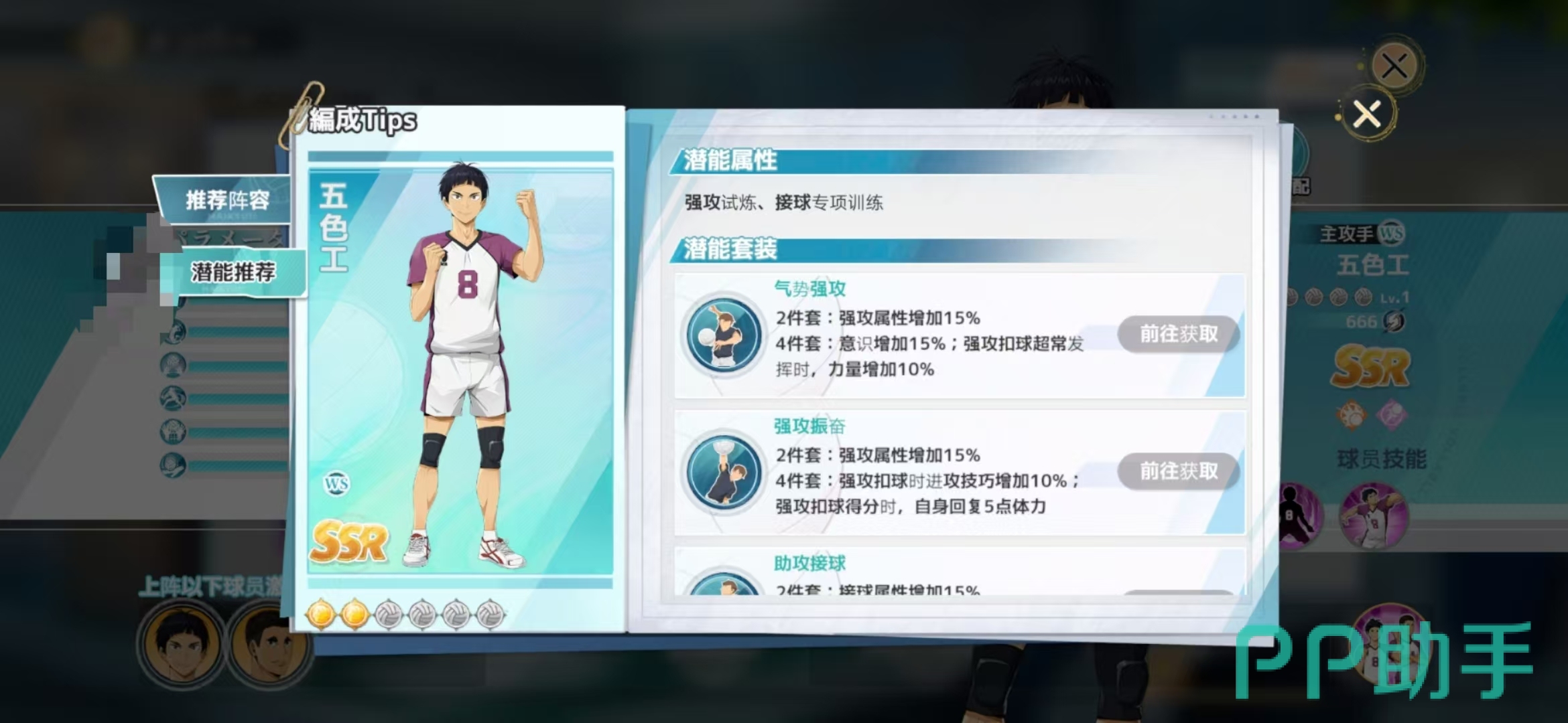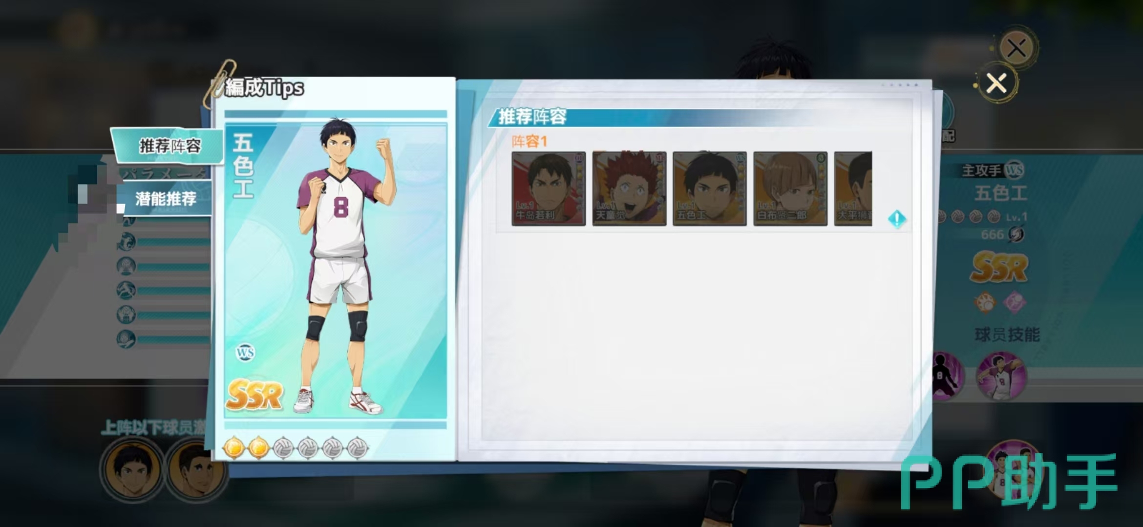 在五色工的阵容组合搭配中,一定要选择的就是大平狮音,他们两个同样作为白鸟泽学院的主攻手在背景故事中也是很好的朋友,同时上场会提高两人的强攻属性,这样五色工的主动技能225%的技术属性就不算低了,二传手根据敌方阵容特性选择赖健太英还是白布贤二郎,副攻手肯定优先选择天童觉,其次才是川西太一,接应的话尽量选择牛岛若利,自由人就是山形隼人,这套阵容主要是以五色工和大平的快速强攻为输出点,其他位置做好接应和传球。