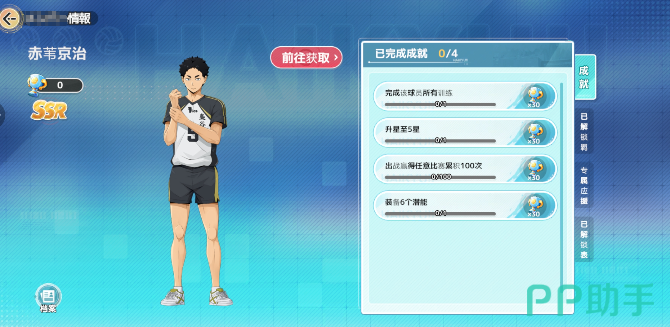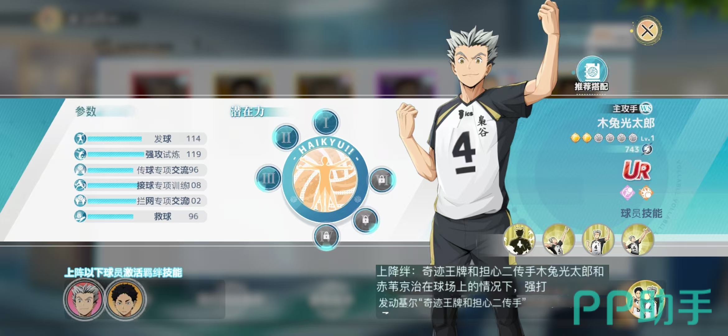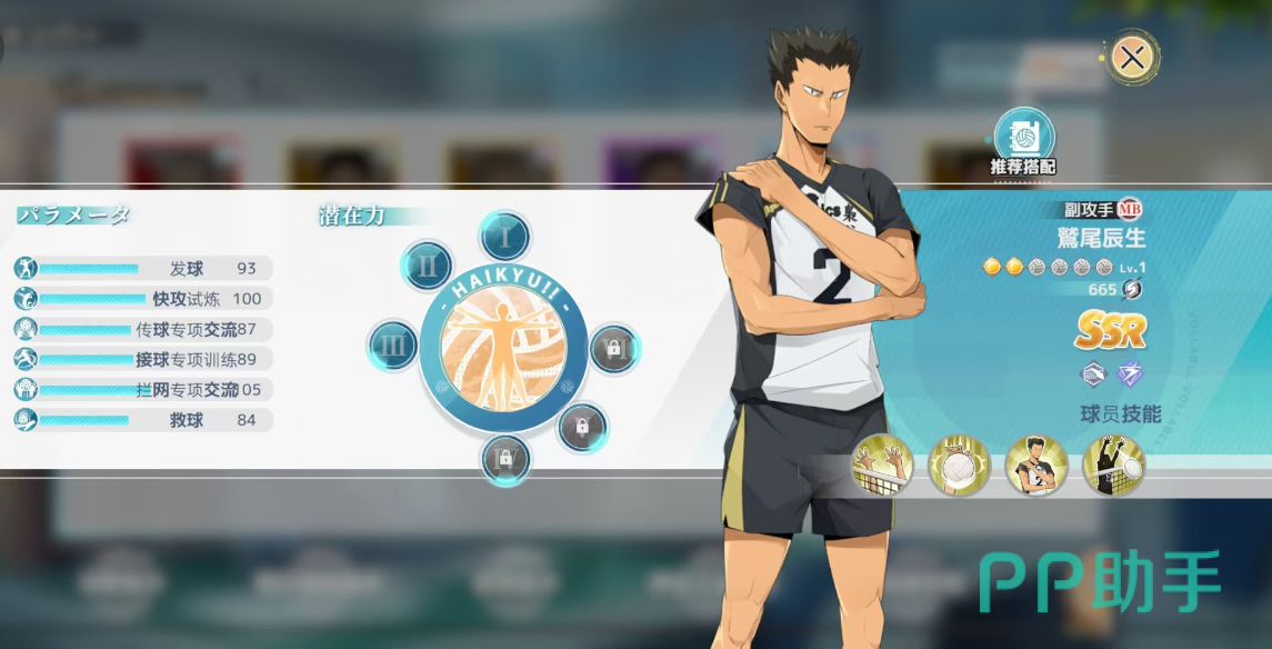 鹫尾辰生,该球员的技能特性都是偏向于拦网的,每一次的成功拦网都会提升后续接球球员的接球威力,而且能够直接改变区块判定区域范围,使得我方队友下一次击球的落点更加完美;尾长涉是最基本的r级卡牌,而且也没有什么特定的上阵组合羁绊,可以当做其他球员的升星材料来用。
