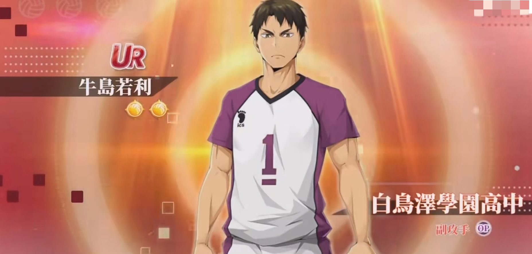牛岛若利拥有着将近1米9的身高,个人的外形看起来就非常的有肌肉力量感,也被玩家们称为拥有了大炮级别的力量,在所有的球员中能够获得绝对得分王的称号更是无法比拟的存在,五色工以及天童觉都是他在动漫和游戏内不可缺少的羁绊和队友,在队伍中所担任的是接应op,也是目前白鸟泽学院中唯一一名接应。