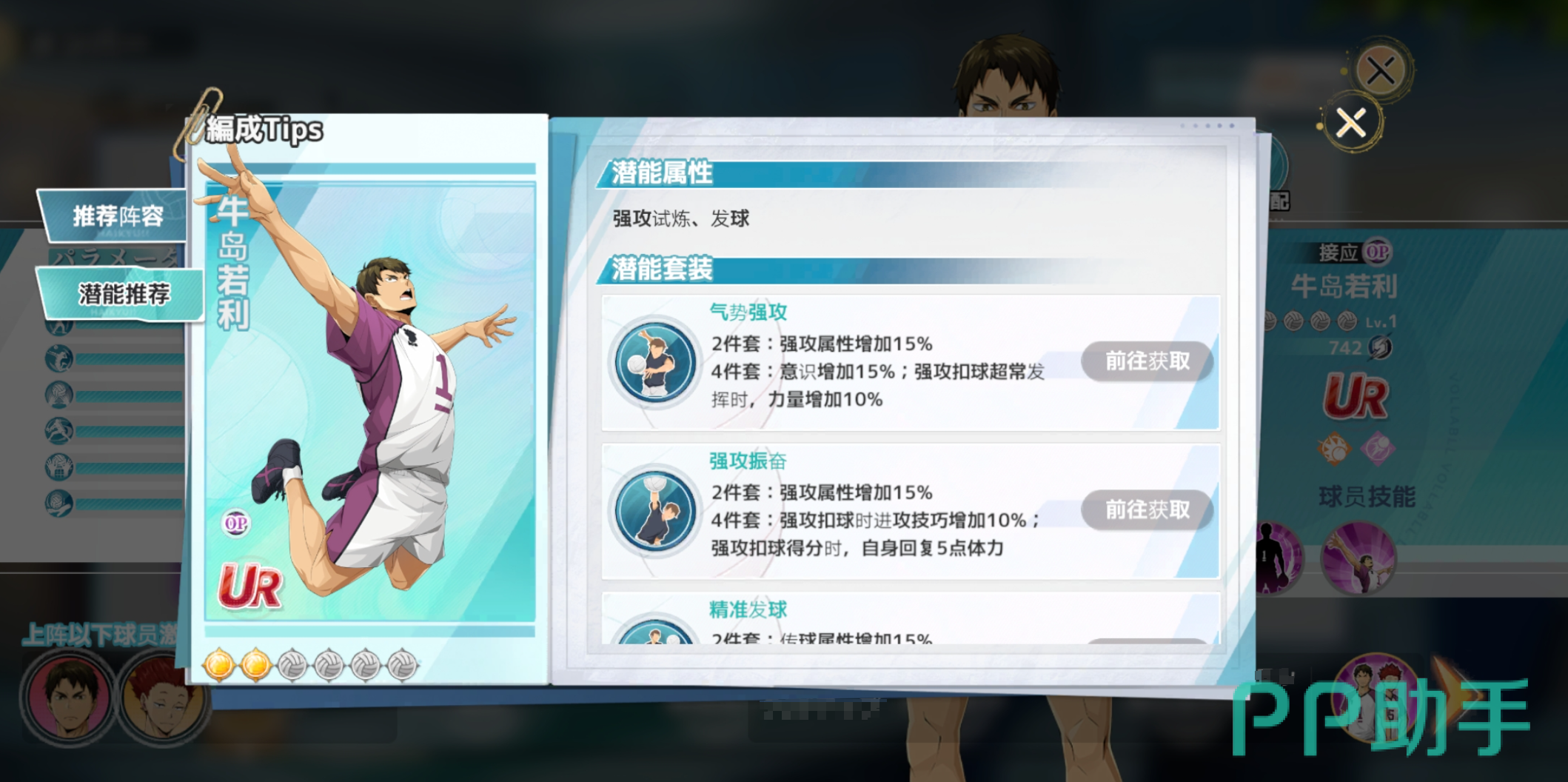 至于牛岛若利的阵容组合其实就是白鸟泽学院的其他橙色品质球员,目前这款游戏的接应位置球员比较少,如果氪金大佬能够抽到的话一定要和白布贤二郎同时上阵,他们两个同时上阵后的基本就是开局就可以直接发动自己的主动绝技。总的来说作为游戏中唯一一张橙卡,他的技能体系基本上包揽了发球传球强攻等多种进攻属性,所以绝不仅仅只能单一局限于某个阵容。