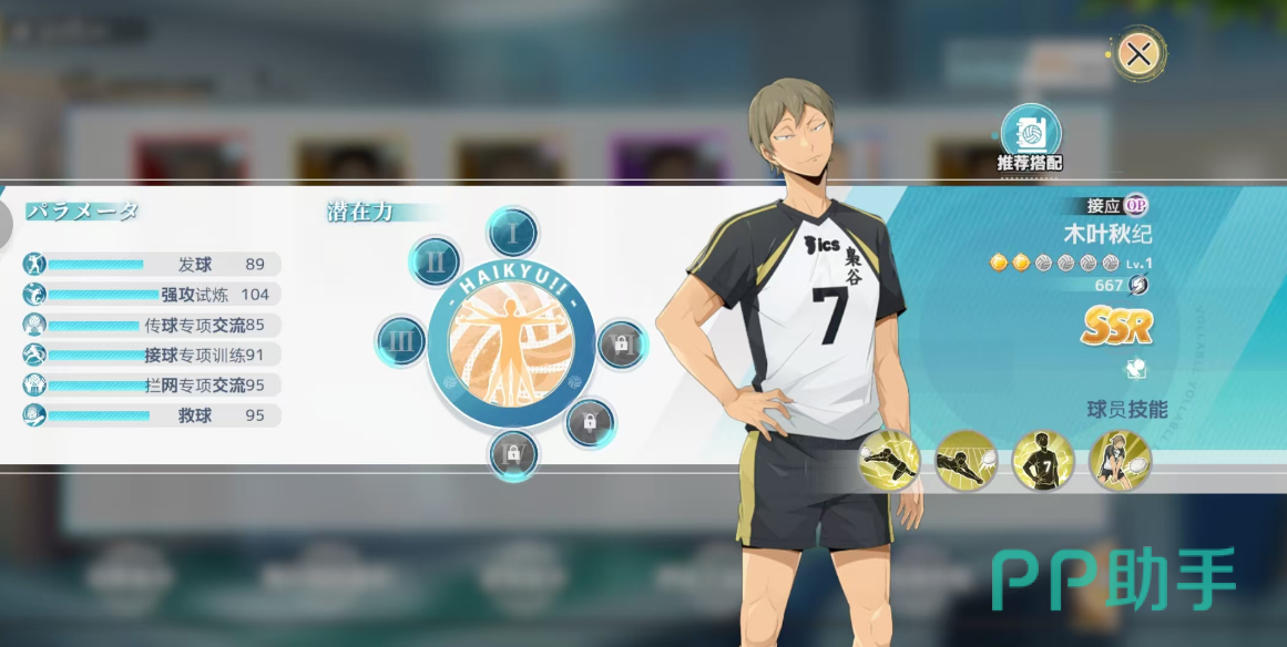 木叶秋纪作为队伍中的接应,和木兔光太郎在游戏内一对比确实木叶的存在感就比较低,但是仍然具备了攻守兼备的能力,在接球上稳定性非常高,而且进攻的威力也是能够创造奇迹的。六大属性中只有强攻能够达到104,但是其他5项全都在90以上,算是比较全面的,作为接应更加全面的属性,能够处理好其余位置传来的球。