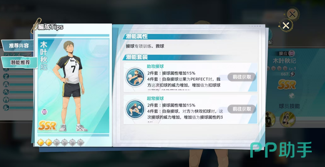 木叶秋纪的第1个羁绊就是进行一次威力为225%的接球,只要此次接球判定不是bad,那么全体士气就会上升20点;第2个技能只要他在前排的时候,前排所有的球员拦网属性和强攻以及快攻属性都会额外上升,他在后排的话,所有的接球和球球属性都会上升;出色的接发球能够使得其提升自身的接发球能力,在士气觉醒期间还能够额外提升。总的来说木叶秋纪的技能就是兼备了一个接应该具有的作用,和木兔一起上场能够更快的进入士气觉醒状态。