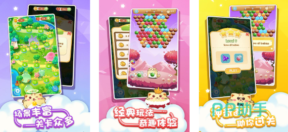 本作是款玩法内容都很经典的竖屏操作泡泡龙射击类消除神作,丰富多样的场景以及众多关卡加持提升了整体耐玩性,经典的发射泡泡消除玩法也给玩家带来了很有趣的体验,各种各样的神奇辅助道具加持能让玩家轻松通关,萌系可爱的美术表现、灵活生动的动态效果也是这款泡泡龙游戏最吸引人的亮点。