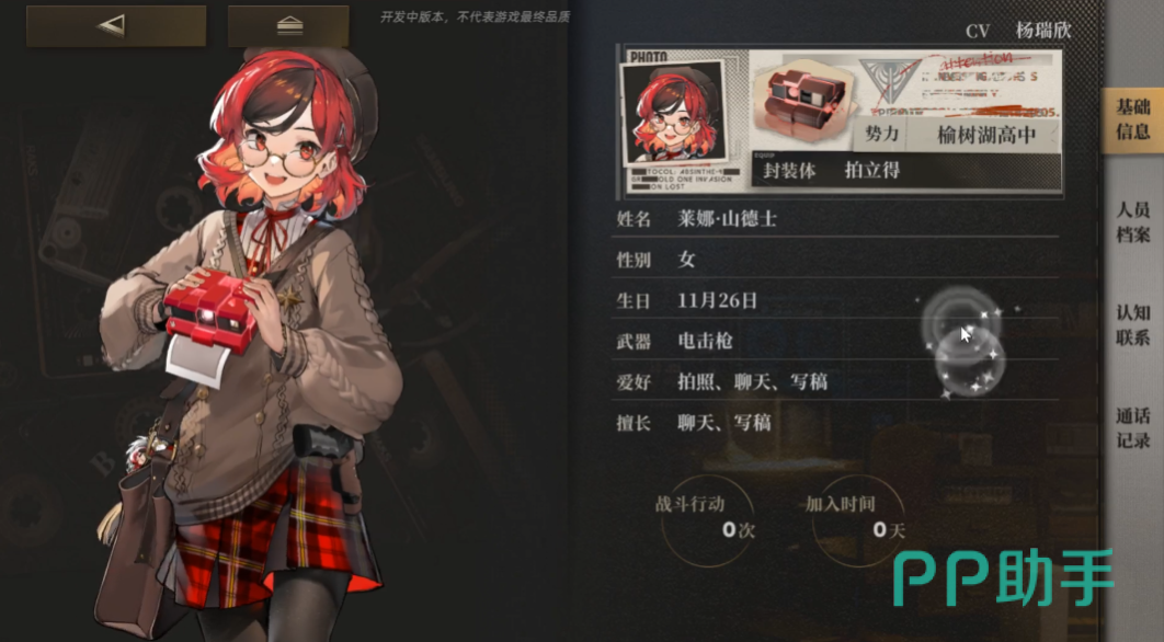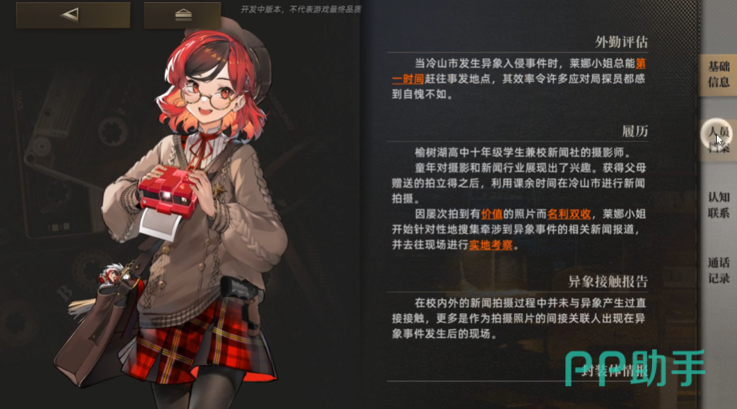 作为新闻社的摄影师,使用的封装体就是手中的拍立得,这个封装体是父母送的,在一次次异象事件的发生中受到影响成为封装体,带来了一个”情报抓取”的作用,在攻击存在迟滞,又或者是束缚的目标时攻击力会得到15%的提升效果,并且让对手的攻击力降低10%。
