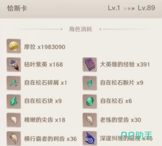 恰斯卡的突破需求主要集中在「自在松石」系列。每个阶段需要的材料为: