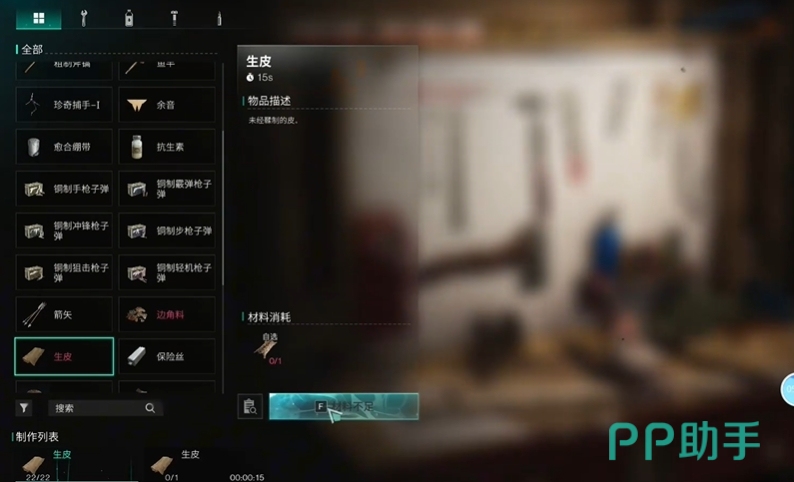 在游戏的后期可以击败熊和鹿来获取各种生皮,熊的位置在恶峰山左上角的熊洞里,里面的熊非常的多,每只熊击杀之后可以获取3~4个生皮,而且熊洞的附近还有大量的蘑菇资源,可以满足当时的资源需求,因为生皮的主要作用就是修理各种装备和制作一些水袋,修理装备的时候会提示使用生皮修理,会提示需要的数量,因为在游戏中缺水会掉血,所以制作水袋是非常有必要的。