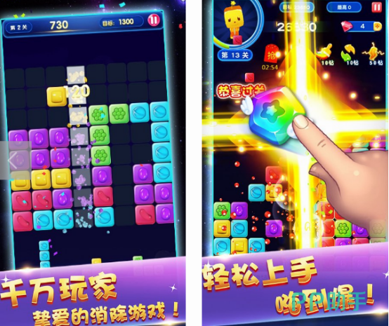 这款游戏也是深受玩家喜欢的,相对于融入了经典俄罗斯方块的游戏来说,这一款是以各种形状的方块为主,当成功连成一排以后顺利的完成消除比较解压。在众多的消除游戏中,它属于画风比较卡通的,无论是大小以及哪一个颜色的方块,都采用的是卡通的人物造型,要掌握游戏的规则,方能帮助玩家取得好的分数。