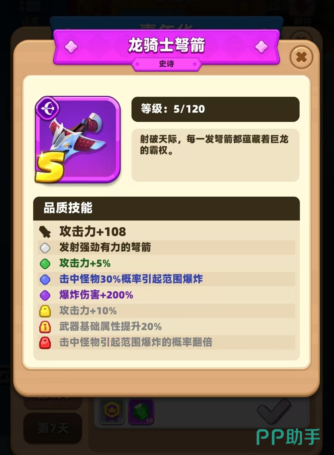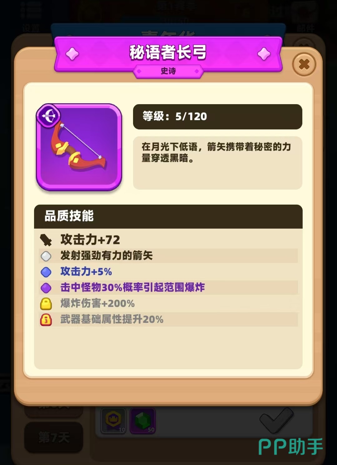 其中秘语者长弓还可以通过合成的手段来获得,所以是玩家上手最为简单的史诗级武器。它能够增加72点攻击力,发射强有力的箭矢,提升5%攻击力,击中怪物后30%几率引起范围爆炸,以及爆炸伤害增加200%,武器基础属性提升20%等,有了这些属性加成,玩家的实力就能大大提升。