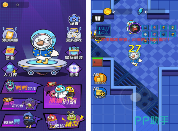 这款游戏就支持双人共同体验,以经典的鹅鸭杀为主要的玩法,虽然里面的角色都是以小动物为主,但是却可通过鸭鹅合作的方式帮助玩家顺利的通过里面的关卡,也是需要不断进行解密的。讲述的就是在一个太空中里面有很多的鹅和鸭子,为了避免被猛鬼追赶,需要利用方法让鸭子躲起来,也能享受追逐躲避的乐趣。