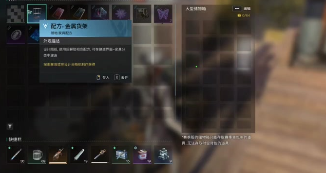金属货架图纸在游戏中只是一个玩具用来增加储物空间的道具,玩家在游戏中没有获得的时候也可以用一些集装箱俩短暂的代替金属货架的储物功能。毕竟这游戏中金属货架图纸不是很稀有的装备。