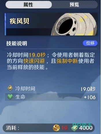 疾风贝有超强的位移与中断机制,19秒的冷却时间,可以带来一次精准闪避,无论面对何种攻势,使用者都能借助疾风贝的力量,朝着预定方向瞬移脱险,甚至打断自身正在施放的技能,很多的对战当中都用得上。