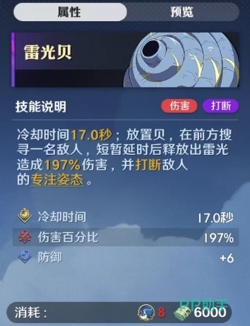 然后是雷光贝,同样拥有17秒的冷却时间,雷光贝能在战场上部署一枚定时引信,静待最佳时机引爆,释放出耀眼的雷电之光,直击一名不幸的敌人,造成高达197%攻击力,而且这道光芒还能打断敌人的专注状态,使其在短时间内无法施展强力技能,为己方创造反击或逃脱的宝贵机会,对于那些擅长控制战场节奏、善于捕捉战机的角色而言,雷光贝是最理想的选择。