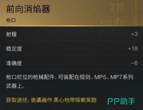 当然武器配件也是不可忽视的一部分,对于短剑冰雨来说,准确度、稳定度和射程是非常重要的属性,因此大家可以选择一些能够提升这些属性的武器配件,如光学瞄具、消音器等,同时加重弹夹也是一个不错的选择,它可以增加每次自动填充的子弹数量,从而提高持续作战能力,首先在枪口配件上面,其实选择前向消焰器是一个不错的选择,这个枪口配件它不仅能在诡谲画作·黑心地带的探索中获得,还能提供+18的探索奖励和+3的射程增强。