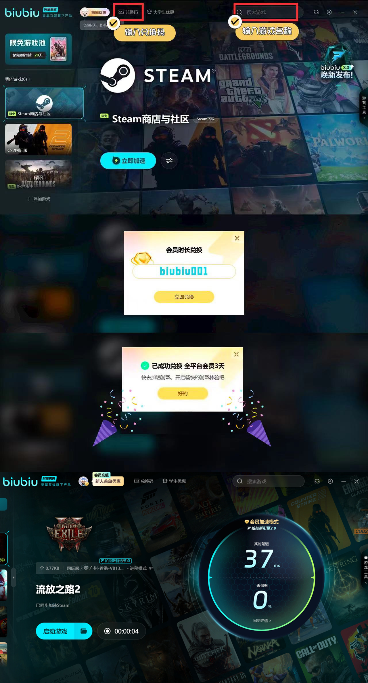 作为一款外服游戏网络要求会比较高,如果在体验游戏时出现卡顿等现象就可以用biubiu加速器。目前还可以领取免费加速时长,新老用户都可以申请。所有的用户在页面输入兑换码【biubiu001】可以享受72小时免费,对新用户而言还可以在第1次注册之后免费24小时能享受双重福利,最终可以免费96小时。
