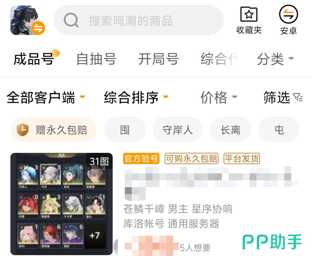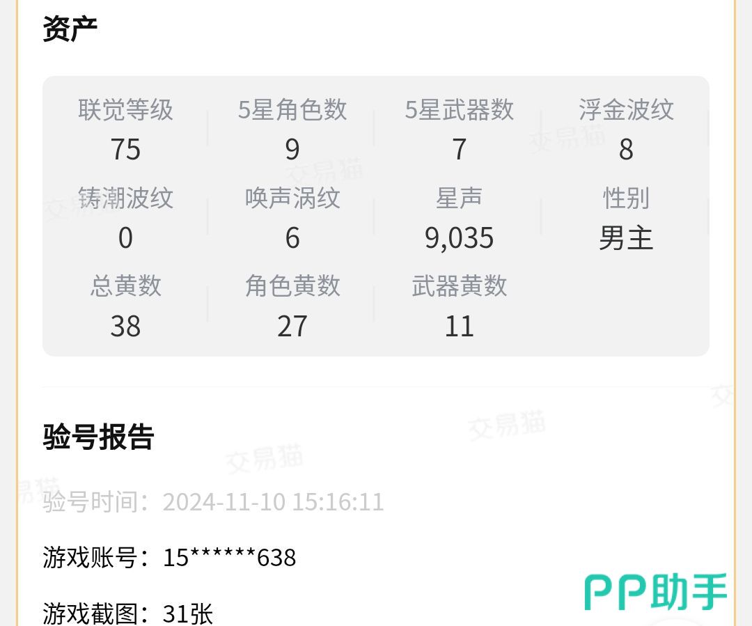 很多时候发布商品信息这件事情如果有卖家自己做的话,说不定就是一段繁杂的文字配上几个图片就结束了,但交易猫去针对鸣潮这款游戏的所有角色都做了缩略图和等级以及命数呈现,而且在资产中也能够快速浏览到联觉等级、五星角色武器数量、各种波纹数量以及黄数等等关键信息,大大促进了交易的成功率。
