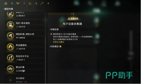 然后就是工艺台、熔炉、拆解台、强化燃油精炼设施、装备制作台、集成厨房、特制储物箱以及太阳能电钻,这8个都是设施类的模因专精,也属于看见就可以选择的类型。而且每一个设施都是有着buff加成的,玩家在选择任意一个之后,都需要尽量把每个设施的每一个buff都叠加上,否则它们的实际意义就不大了。