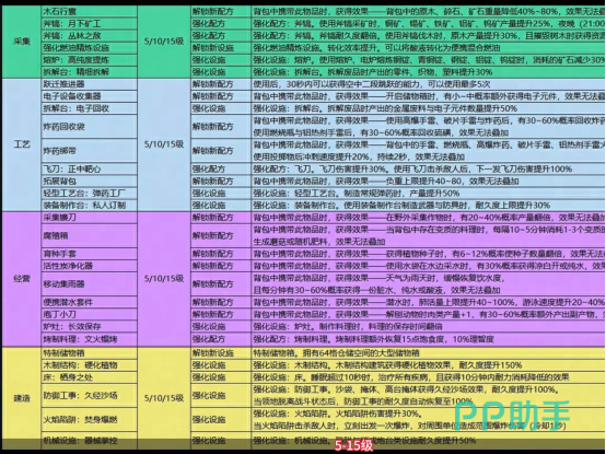其中工艺台可以增加子弹的产量和治疗量等;熔炉可以在玩家烧砖和玻璃时缩短时间并增加产量;拆解台在拆解物品时可以提升得到的零件数量;强化燃油精炼设施可以提升酸转化成混合燃油的效率;装备制作台制作出来的武器或是防具,都可以提升耐久度;集成厨房可以缩短料理的制作时间,并且提升料理的基础效果;特制储物箱让玩家获得64格储物空间;太阳能电钻可以提升矿物的采集数量。
