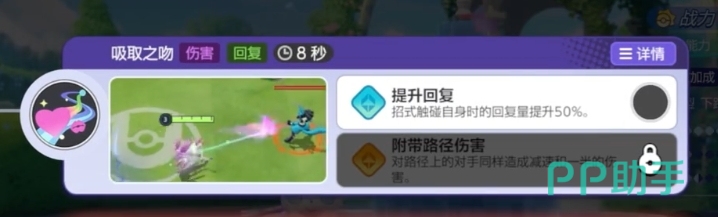 当飞吻传回到仙子伊布自身时,她会恢复一定的生命值,而当飞吻碰到对方时,则会造成减速效果。如果与目标的距离过远,飞吻则会消散,伊布的被动技能妖精皮肤使她在每次造成或受到伤害时,在1.5秒内提升2.5%的特攻和特防,这一效果可以叠加最多六层,总计增加15%的特攻和特防,这一特性使得伊布在战斗中尤其适合针对对方的特攻型宝可梦。