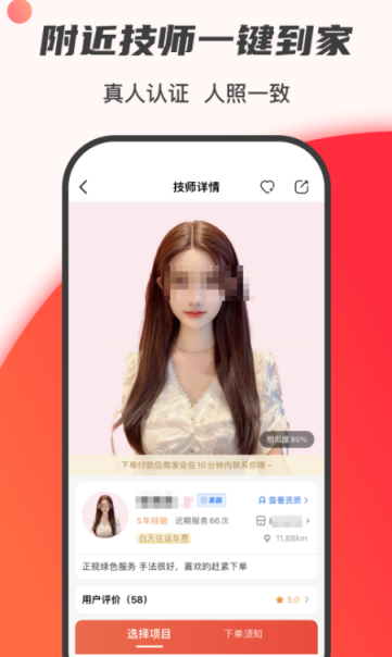 目前此平台已经服务全国将近200多个城市,获得了非常高的评价,还新增了速必达功能,为用户提供的服务种类也比较丰富。有中医推拿、spa推拿、中医等品类,并且每一位技师都是经过专业的培训,拥有扎实的基础,是一款能够让用户放心选择的软件,支持技师扫码实名认证,可以让用户享受到非常优质的服务。