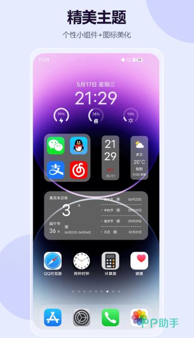 如果你对主题壁纸非常感兴趣的话,不妨选择这款应用,高清动态壁纸全面推送会根据你的实际喜好以及搜索模式推送出适合你的内容,除了各类型壁纸之外,还有小组件、qq微信皮肤以及图标皮肤等等。其中的小组件非常丰富,比如纪念日、倒计时、步数,可以自由选择个性化定制,打造出属于你的心动桌面。