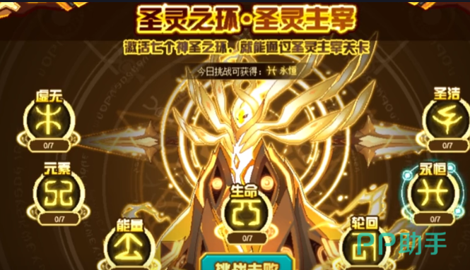 圣灵主宰:这一个关卡主要的打法就是把每一种属性都打到七,每次击败之后就可以提升一个进度,如果失败的话就可以获得碎片。绝大部分情况下,24个神圣之灵就可以获得一个进度。