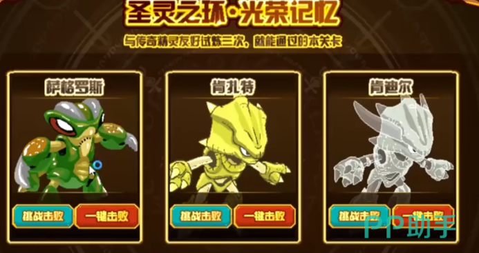 荣光记忆:玩家所需要做的就是打败三个精灵,然后通过系统提供的普尼马上就能顺利的通过,别忘记还需要和传奇精灵好友一起去试炼三次,每天有10次挑战的机会。