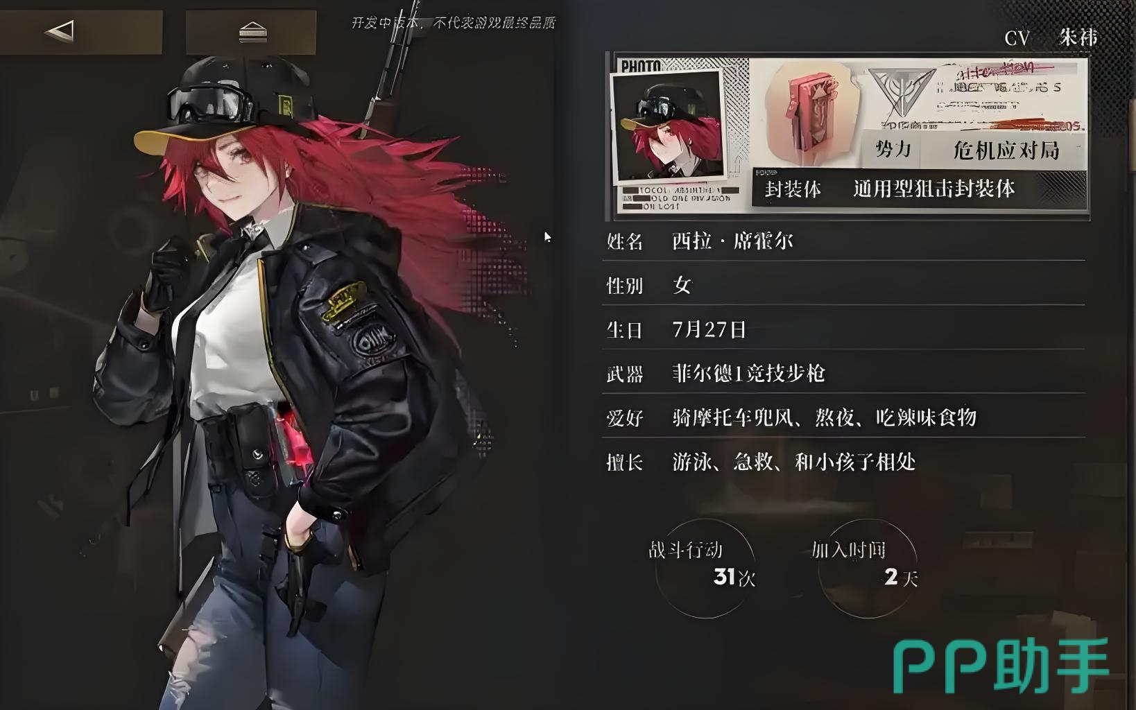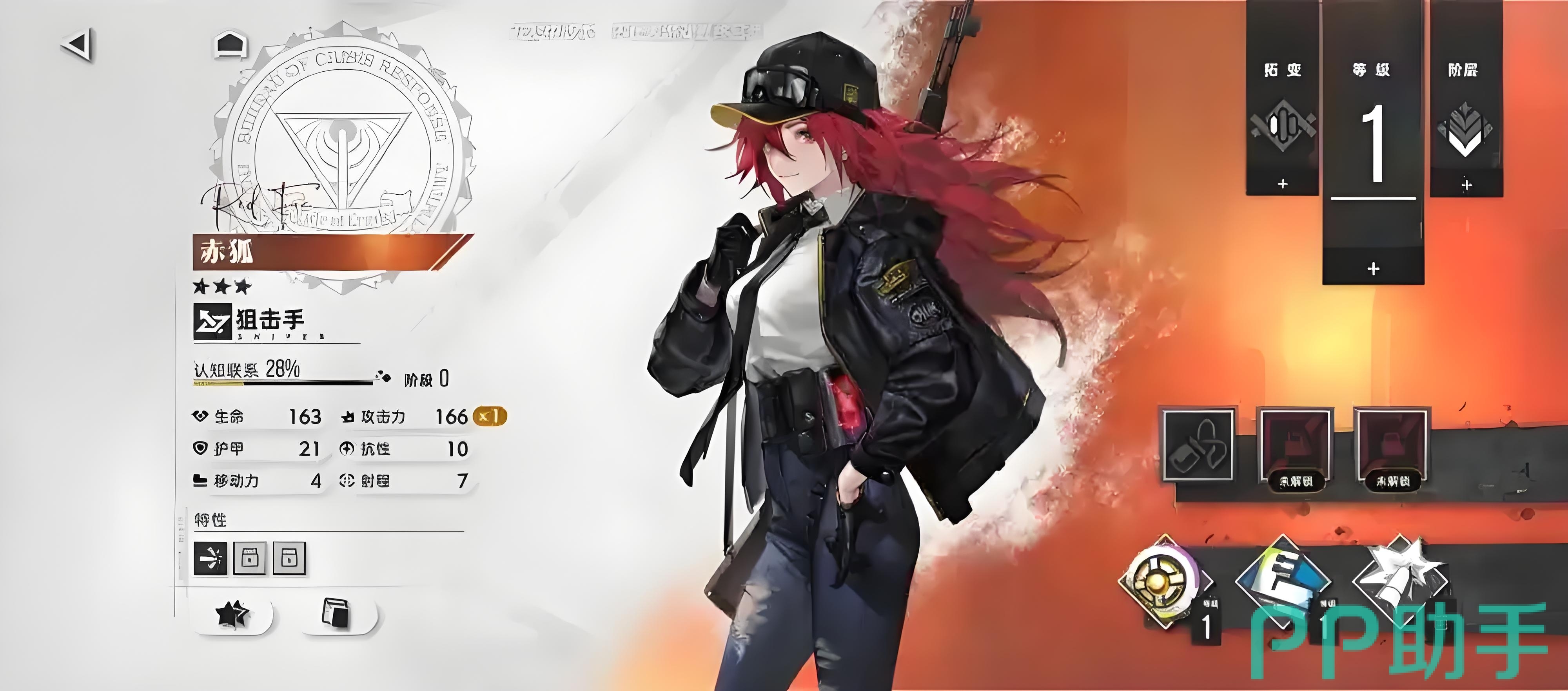 赤狐这个角色的外形是一个英姿飒爽的小姐姐形象,一头绯红色的头发,上身穿着一件白色衬衣,外面有穿着一件黑色的机车皮衣,下身穿着一条高腰破洞牛杂裤,背后又背着一把狙击枪,给人一种非常干净利落的感觉。