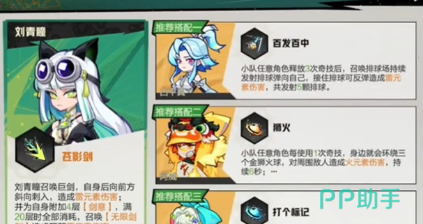 刘青瞳的所有的技能使用出来连接性非常强,能够在战斗中灵活的切换各种技能使用,有可以持续输出的技能,也有能够造成一次性大量伤害的技能,技能组合之下可以在战斗中既能拥有优秀的防守,也能有非常强大的进攻能力,唐霜技能组合非常多样,既可以作为团队的输出核心,也能够作为后排的辅助角色,操作难度较高,不适合新手玩家使用,在战斗的时候建议与团队搭配一起出场,只有队友一起才能够造成最高的伤害能力。