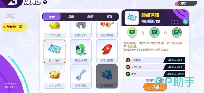 因为这款持有物主要提供的是防御能力,能够帮助新手玩家更好地应对游戏中的操作问题,它通过借助气势腰带来提升自身的防御力,新手玩家可以更加轻松地掌握路卡利欧的操作技巧,这样搭配的话大家就可以选择弱点保险,这个持有物则是一个为路卡利欧提供额外伤害加成的搭配,当受到伤害时,它能够获得增伤效果,最多可叠加4层,这意味着在战斗中路卡利欧可以不断积累增伤效果,从而在关键时刻释放出惊人的伤害,这种持续增强的输出能力还是很适合路卡利欧的。