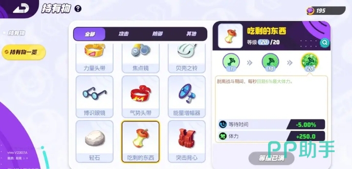 不用气势头带的话,大家也可以上吃剩的东西,它能够让路卡利欧在脱离战斗后每秒恢复6%的最大体力,这意味着在战斗结束后,路卡利欧可以迅速回复状态,为下一波战斗做好准备,对于那些喜欢频繁开启团战的玩家来说,这个持有物才是最适合的,而且这个持有物与上述其他持有物搭配使用时效果不会打折哦!