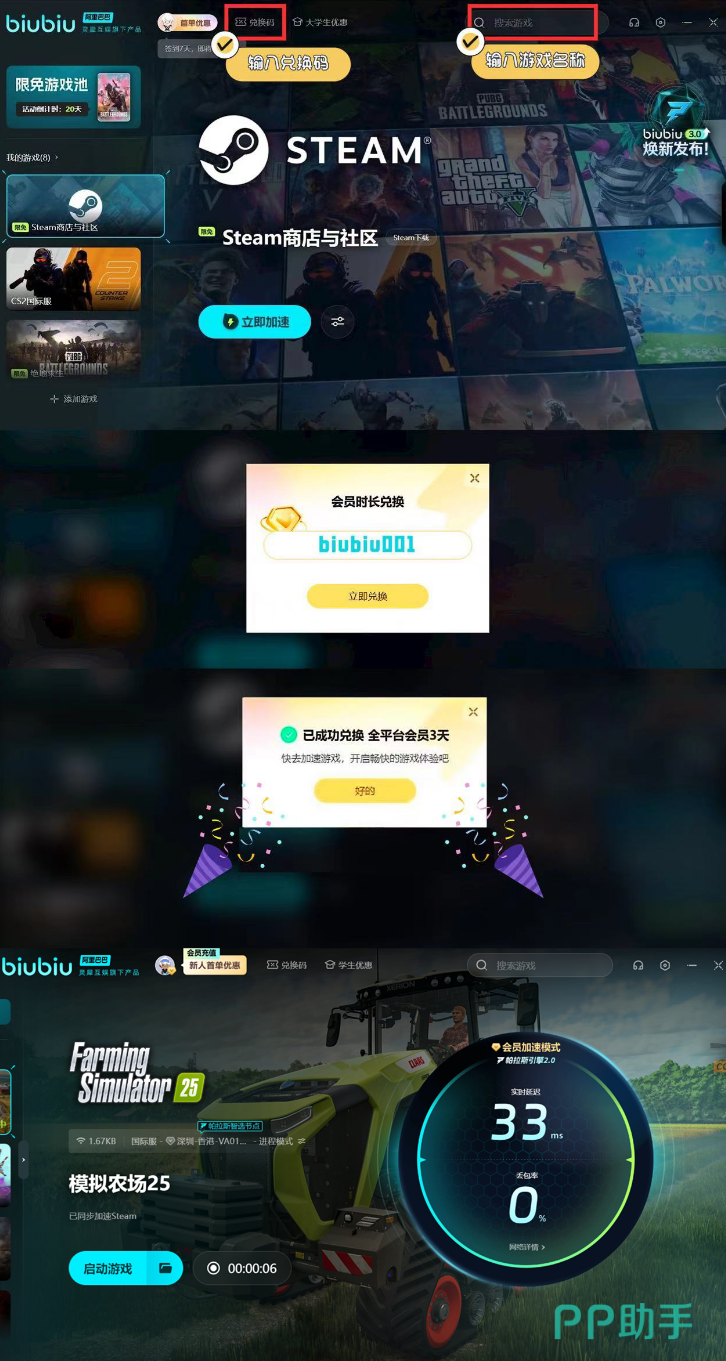在享受农场乐趣的同时,我们也不能忽视网络流畅性的重要性。这样biubiu不仅可以帮助你去平台进行下载,更能够成了你流畅游戏的得力助手,只需输入兑换码“biubiu001”,你便能获得72小时的免费加速时长,再加上新人专享的24小时免费加速,总计96小时的畅快体验,让你的农场之旅更加无忧无虑,尽情享受田园风光的每一刻。