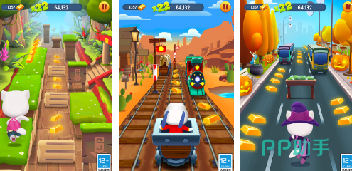 跑酷的场景比较多变,不仅有青青草原主题,玩家还会前往村庄以及树林等多个元素的跑道中进行奔跑。以汤姆猫为主要的跑酷角色不仅可以随时更换,而且还可以穿戴吊带以及帽子等多种物品。在每一个跑道场景中,玩家既可以解锁宝箱,也可以更改前进的方向,从而使得更多的金砖。