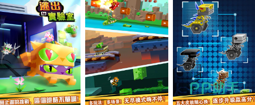 实验室充满着各式各样的机关,玩家需要躲避这些机关完成逃跑目标。在五大不同种类的皮肤当中,玩家可根据心意进行及时更换并且逐步升级到最高等级。跑酷的场景元素比较丰富,不仅有可以发射子弹的大炮,玩家有时候还需要面临悬崖的危险。在更多场景主题中,玩家可选择无尽模式肆意体验。