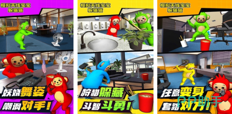 天线宝宝是很多人都比较喜欢的一个动画形象,现在在模拟天线宝宝躲猫猫这个游戏里就可以扮演成这些可爱的天线宝宝开启一场充满童趣的变身躲避大作战,如果玩家扮演的是躲避者,那么在游戏里就可以变身成为各种不同的物品,假如是抓不住的话,就需要观察游戏场景中不合理的物品,然后使用各种武器强制对方现身。