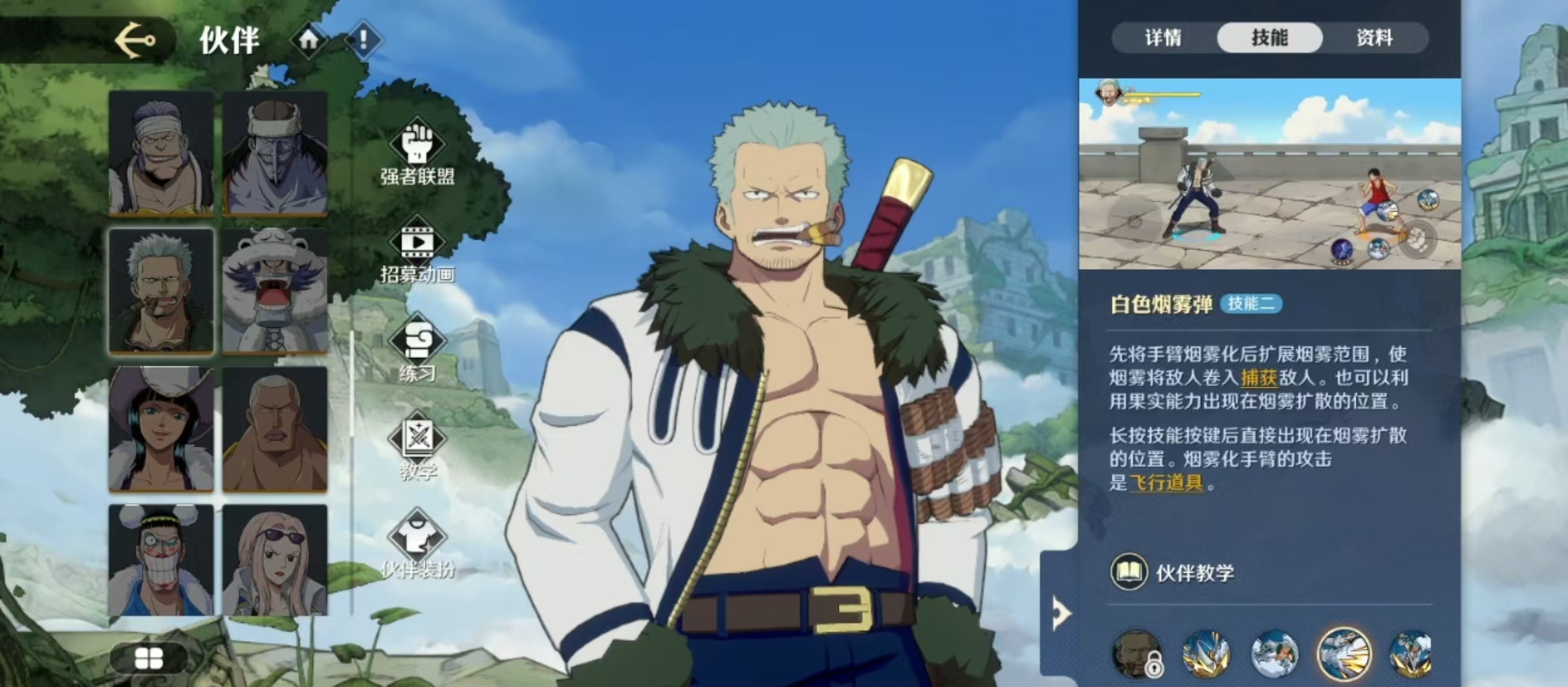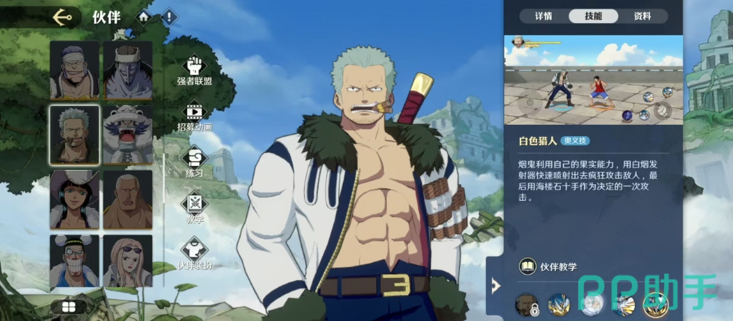 奥义技能是白色猎人,利用自身的果实能力,使用发射器喷射出去疯狂攻击敌人,最后用海楼石十手作为决定性的最后一次攻击。最后是自身作为援护出场之所能使用的援护技是白色烟雾弹,当呼唤烟鬼加入战场后,烟鬼就会使用白色烟雾弹将敌人捕获。当然相信很多玩家都不会将其作为援护出场,而是作为主力去重点练习和培养。