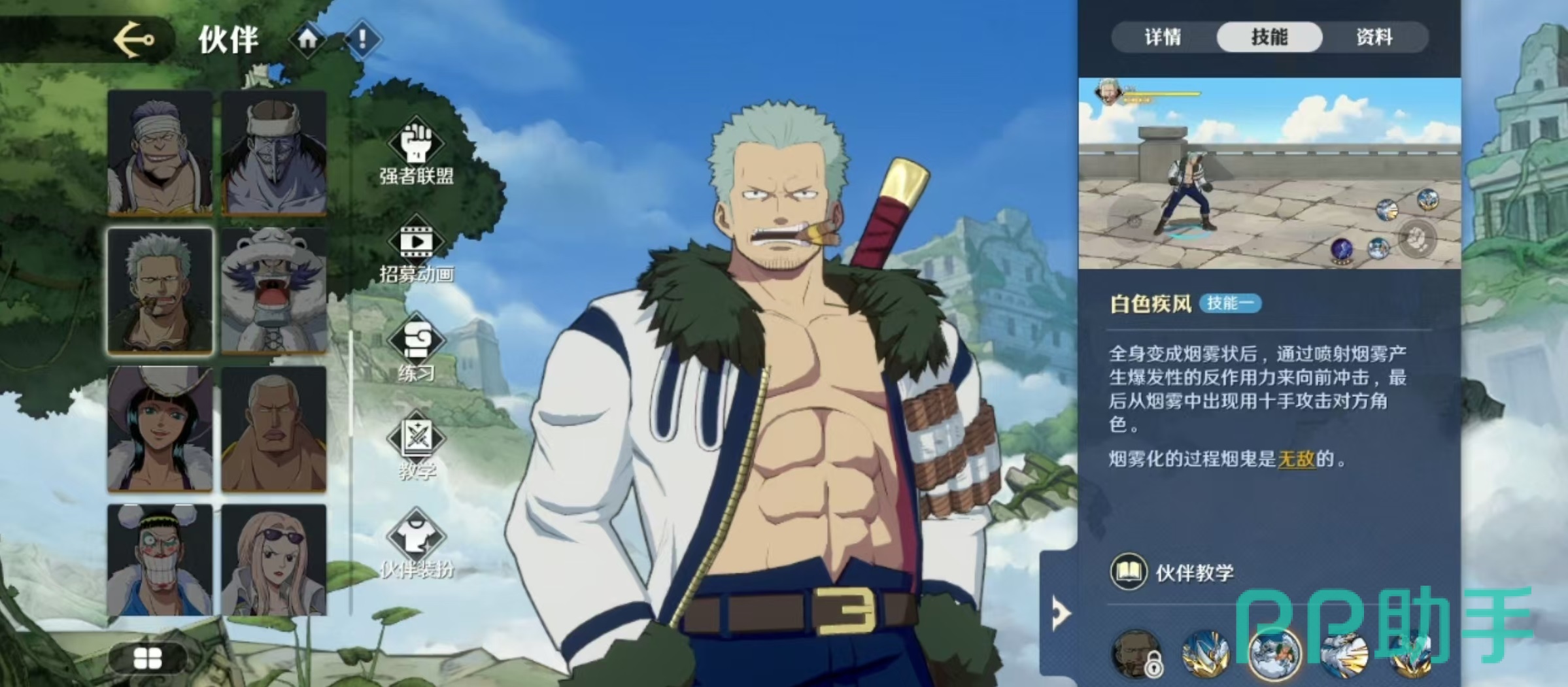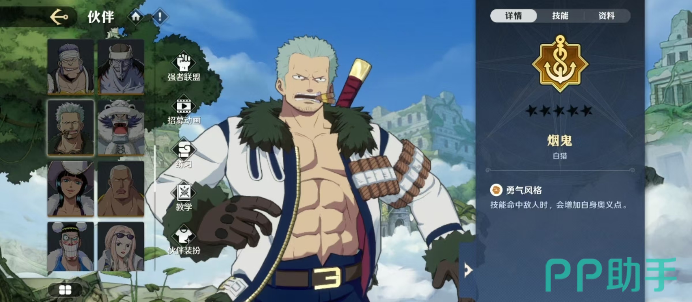 在航海王中,烟鬼是非常知名的角色,不仅外形令人印象深刻,更是有着很强的战斗力,航海王壮志雄心中的烟鬼也同样是热门的人选,今天小编就来介绍一下航海王壮志雄心烟鬼技能有哪些。对于玩家来说,了解这些人物的技能效果非常重要,可以帮助大家在战斗中快速上手应对。