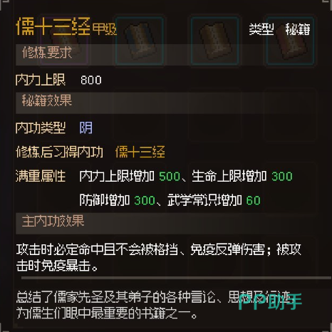 儒十三经作为甲级内功,其效果卓越非凡。在发起攻击时,它确保每次命中目标,不受格挡或免疫反弹伤害的影响。即便是在遭受攻击的情况下,它也能提供暴击免疫的保护。当内功达到满重状态时,内功上限可提升500点,生命值和防御力各增加300点,武学常识亦可增加600点。因此,儒十三经的内功效果无疑是非常强大的。