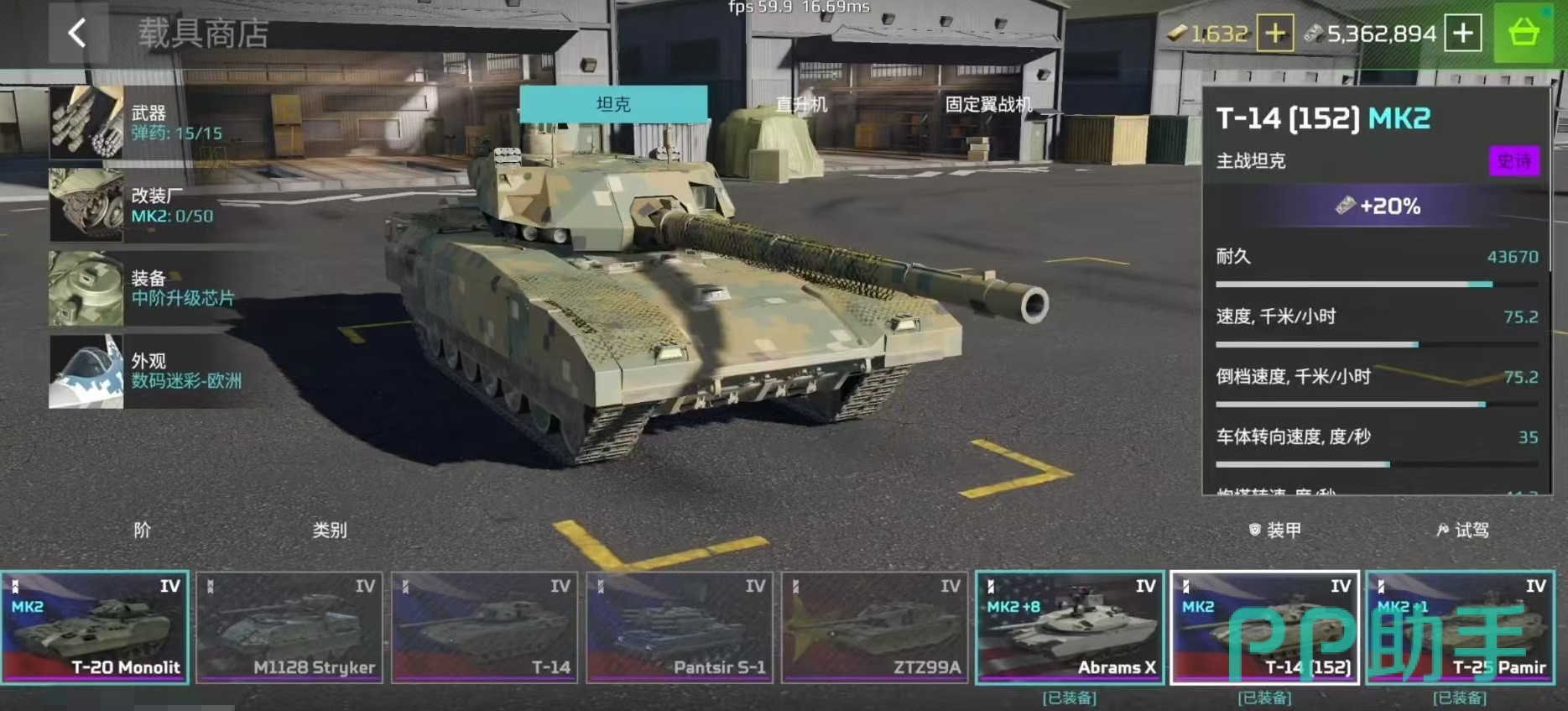 在目前游戏开放的坦克载具中,小编首先推荐大家选择的是t-14主战坦克,这也是通行证中可以让大家免费体验的车辆。它装备了152毫米口径主炮,是目前世界上威名赫赫的主战坦克之一。它最大的特点就是有着强大的火力和优秀装甲,在操作过程中可以带来令人手感十分舒适的机动性,无论是转弯、倒车或者是炮塔旋转,都可以达到精准控制。作为一款手机游戏,操作感才是最重要的方面。虽然这是一个免费车辆,但是在各项属性方面都非常出色,尤其是自身的主炮打出的伤害非常可观。