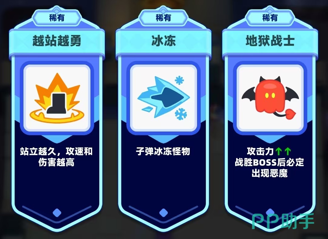 这里所说的技能指的就是大家在游戏中通过升级可以获取的新能力。游戏里的技能种类很多,简单来说可以分为直接提升伤害,提升生命值,提高射击的速度,召唤各种精灵,以及获得旋转飞球等。大家在进行技能搭配的时候,一定要遵循一个原则,那就是重点强化一个方向,千万不要多个方向共同选择,这样会导致战力分散,很难战胜最后的boss。